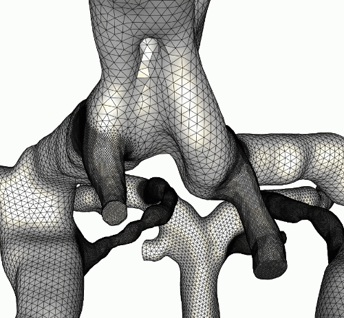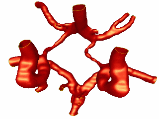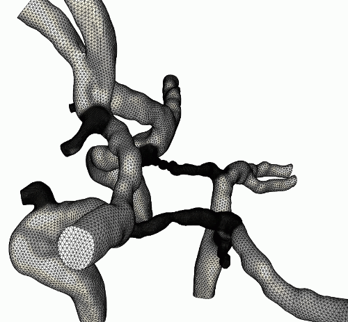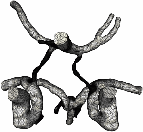 This example illustrates the process of grid generation starting from medical images. In this case a model of the circle of Willis was reconstructed from contrast-enhanced MRA images using a region growing algorithm.