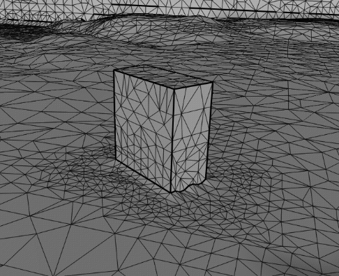 This example illustrates the procedures in a case of merging a terrain and several buildings. The following image shows the triangulation of the terrain.