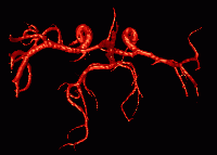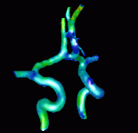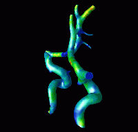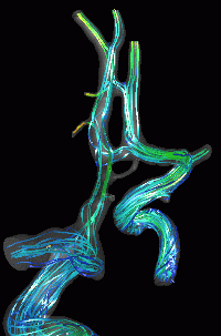 Finally the next two images illustrate how CFD calculations could be used for planning interventional procedures. In this case the occlusion of a cerebral artery is simulated and the new flow redistribution and flow patterns are obtained. The figures below show some instantaneous streamlines before and after the occlusive maneuver has been performed.