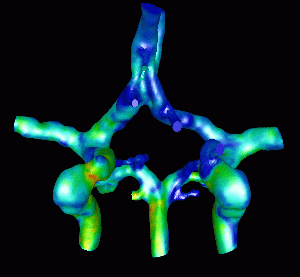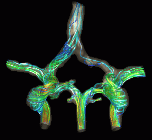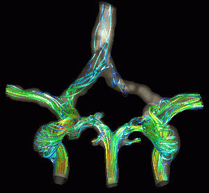 The next figures show the application of CFD modeling to surgical planning. In this case one of the cerebral arteries is temporarily occluded and the new flow redistribution is calculated. The flow patterns before and after the occlusive maneuver has been carried out are shown below.