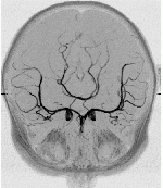 First the anatomical 3D images are processed and segmented in order to label the voxels that belong to the desired arteries. This process is illustrated in the next two images where the maximum intensity projection (MIP) of the images before and after segmentation are shown.