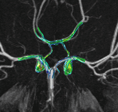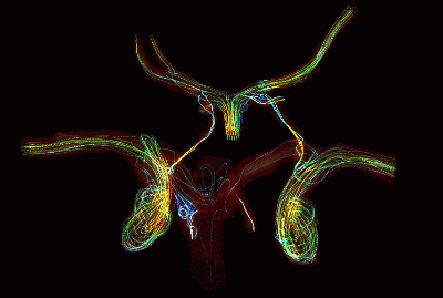 This example shows the combination of traditional flow visualization with volume rendering techniques. In this case the blood flow in the circle of Willis was computed in a realistic model reconstructed from contrast-enhanced magnetic resonance angiographic (MRA) images.