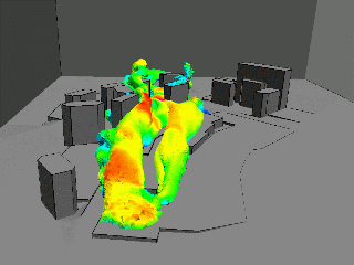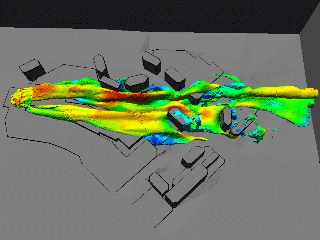 The following image shows the surface of the buildings colored with the toxic material concentration some time after the release.